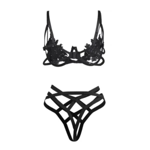 Unleash your confidence with this captivating black strappy lace lingerie set. Featuring a delicately embroidered lace bra with seductive strappy accents and a matching high-waisted thong, this set is designed to embrace your curves and make you feel irresistible. The beautiful floral detailing adds a touch of elegance, while the bold straps enhance the daring,…