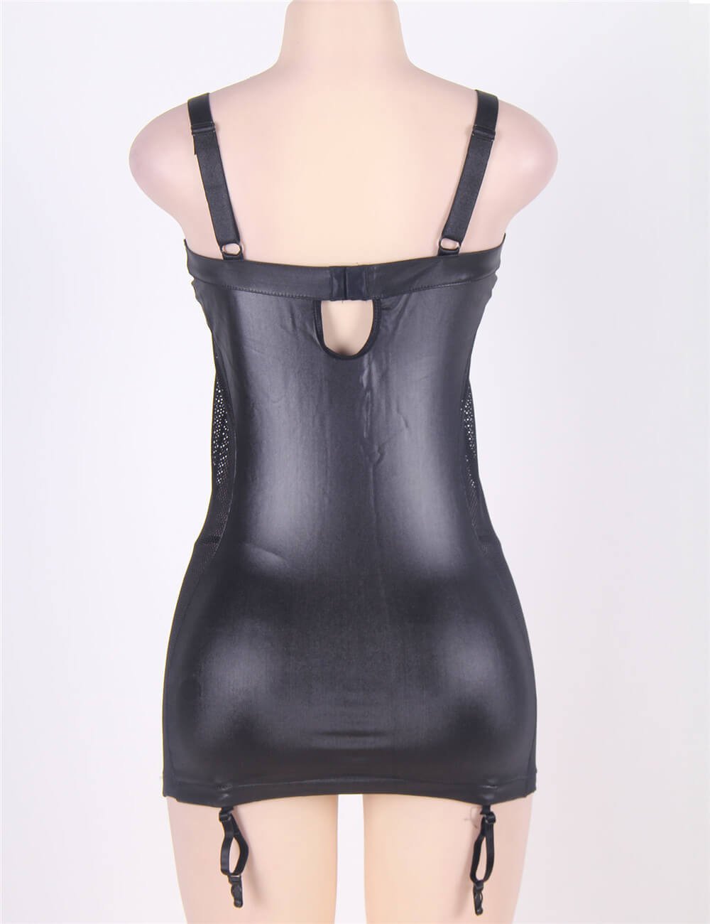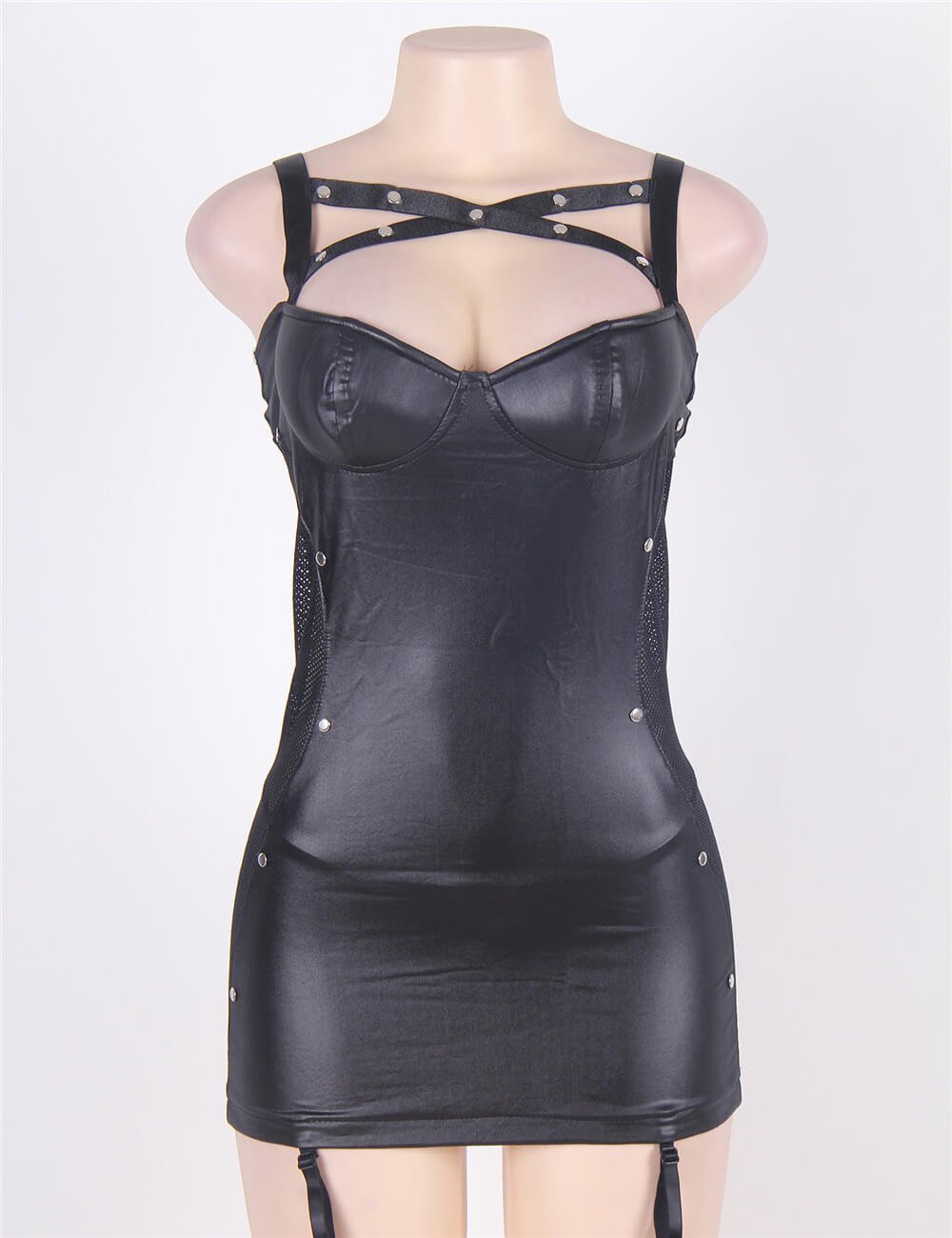 Turn heads and ignite confidence in this stunning black faux leather bodycon dress, meticulously designed to accentuate your curves. Featuring sleek adjustable shoulder straps and eye-catching metal stud details, this dress radiates edgy sophistication—ideal for unforgettable nights out or intimate evenings in. The attached garter straps add a sultry finishing touch, perfectly complementing your favorite stockings for a daring, complete look. Available in classic black and a range of sizes to ensure your perfect fit, this dress is your new go-to for making bold style statements.